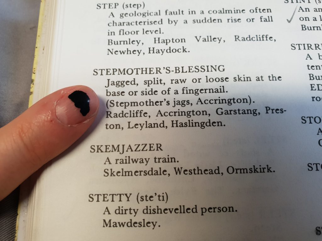 Jagged, split, raw or loose skin at the base or side of a fingernail. Also known as stepmother’s jags (Radcliffe, Accrington, Garstang, Preston, Leylannd, Haslingden).